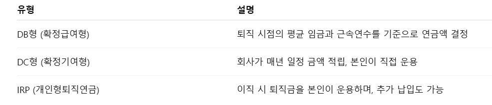 퇴직연금은 크게 아래와 같은 세 가지 유형으로 나뉩니다: