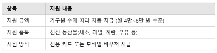 농식품 바우처는 저소득층 가구를 대상으로 신선 농산물 구매 비용을 지원하는 제도입니다. 이를 통해 영양 불균형을 해소하고 건강한 식습관을 형성하도록 돕는 것이 목적입니다. 지원금은 일정 금액의 바우처 형태로 지급되며, 지정된 농산물과 식품 구매에 사용할 수 있습니다.
