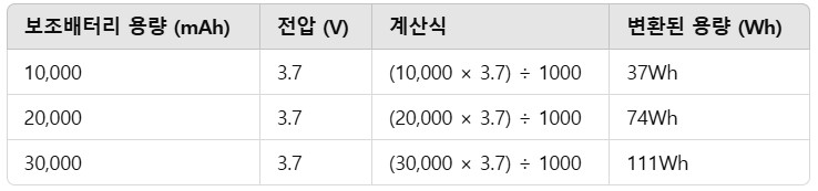 보조배터리 용량은 보통 mAh(밀리암페어시) 단위로 표기되지만, 항공사에서는 Wh(와트시) 기준으로 반입 제한을 두고 있습니다. Wh 단위로 변환하는 방법은 다음과 같습니다.