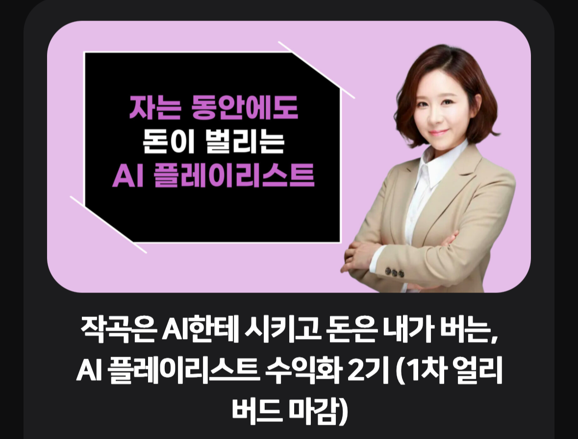 온갖 부업 수익화 관련 강의들이 계속 눈에 띄는 건 내가 여기에 관심이 높단 걸 알아챈 알고리즘 탓일까ㅋㅋㅋㅋ 하루에도 수십개가 뜨는 것 같은데 그 중 눈에 콕 들어왔던 사이클해커스 : 제이린쌤 AI 플레이리스트!!! 유튜브에서 플레이리스트 채널 구독하고 들어본 적은 많지만 AI 플레이리스트 란 말 자체가 신선해서 일단 무료강의부터 신청