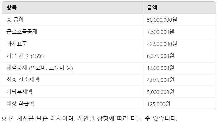 다음 표는 연봉 5,000만 원을 기준으로 간단한 연말정산 모의계산 예시입니다.
