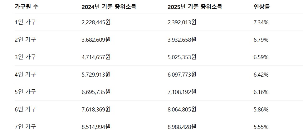 2025년 기준 중위소득은 전년 대비 6.42% 인상되었습니다. 이는 2015년 맞춤형 급여체계 도입 이후 최대 인상폭입니다.