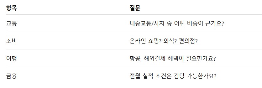 카드마다 전월 실적 조건, 한도 제한, 적용 가맹점이 다르기 때문에 꼭 확인!