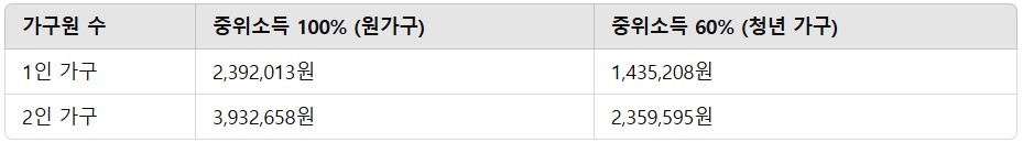 참고: 중위소득 기준은 매년 변동될 수 있으므로, 정확한 금액은 최신 공고를 확인하시기 바랍니다.